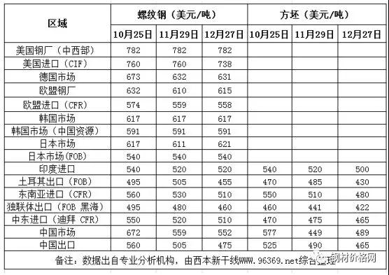 方坯價(jià)格方面:12月份與11月同期相比,土耳其出口報(bào)盤(FOB價(jià))下跌55美元/噸,獨(dú)聯(lián)體出口黑海報(bào)盤(FOB價(jià))下跌19美元/噸;中東市場進(jìn)口價(jià)下跌10美元/噸,東南亞進(jìn)口(CFR)價(jià)格下跌30美元/噸。